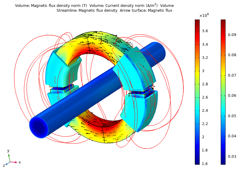 The ABB team turned to the software yet again in order to optimize the split-core current sensor design before prototyping. Paudel has been using it for a long time and enjoys its “ease of use, and the fact that it has the same interface for multiple physics and is easy to couple with other physics.” The COMSOL software includes built-in settings for implementing Maxwell–Ampère’s law and an interface to solve for the magnetic fields in the frequency domain (Figure 5). By using geometric symmetry, the ABB team only has to model one-fourth of the coil, saving time, effort, and computational resources. A special coil modeling feature enables the team to set up the primary coil as a solid conductor and the secondary coil as a homogenized multiturn coil. A boundary condition describes the area where the tangential component of the magnetic field and surface current density is zero as a perfect magnetic conductor, and the external boundaries are set to be magnetic insulators. Solver features enable the team to easily adjust the settings between solid and homogenized conductors, and solid conductors versus wires.