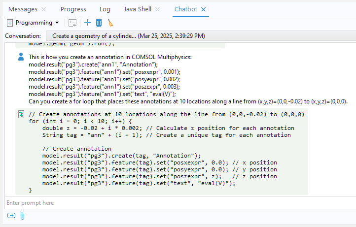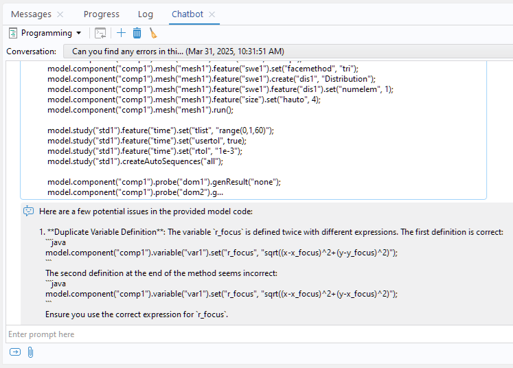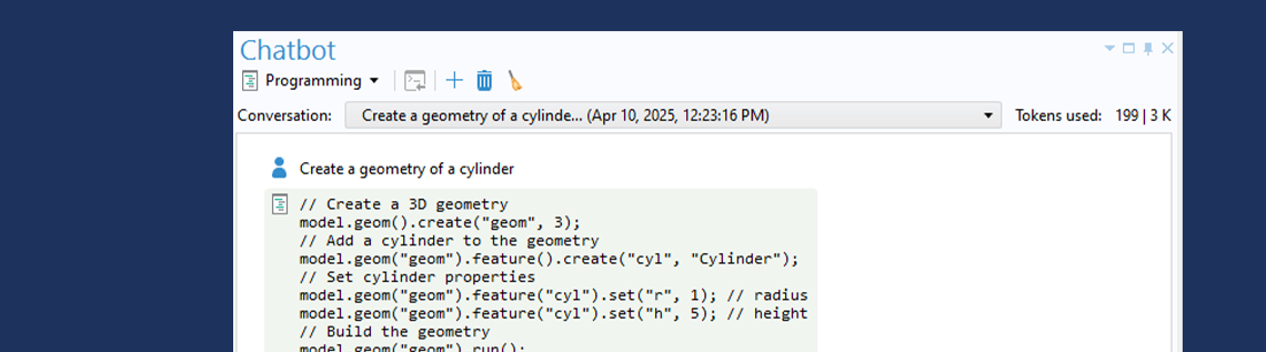 When building multiphysics models and simulation apps, the COMSOL API lets you write code to automate workflows, add custom functionality to your apps, and integrate with external tools. The Chatbot window functionality introduced in COMSOL Multiphysics® version 6.3 connects you directly to OpenAI™ GPT models, allowing you to generate or debug COMSOL API code. For example, it can help convert repetitive tasks into for loops or locate logic errors in a method. You can also use the Chatbot window to query for general modeling advice.