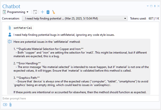 A close-up of the Chatbot window with Conversation set to: I need help find potential bugs in setMaterial, ignoring any code style issues. In this case, the bug was relatively easy to spot without the help of the Chatbot window. However, imagine if the app supported 40 or 50 materials instead of just five; in such cases, when working with longer code blocks, using the Chatbot window can greatly accelerate the debugging process.