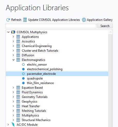 A close-up of the Application Libraries with the Pacemaker Electrode model highlighted. If the model has not yet been solved, click Compute. The computation will take a few seconds.